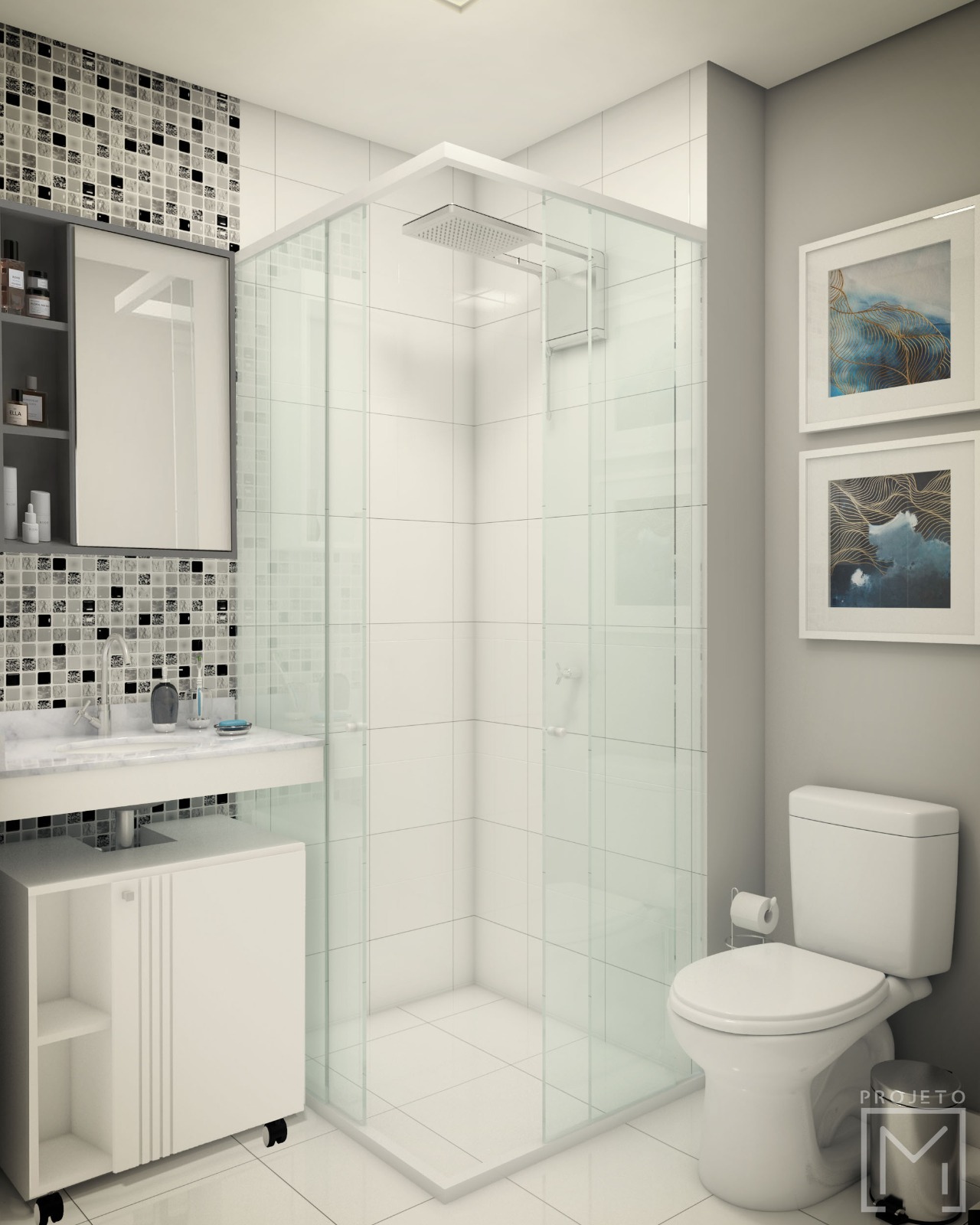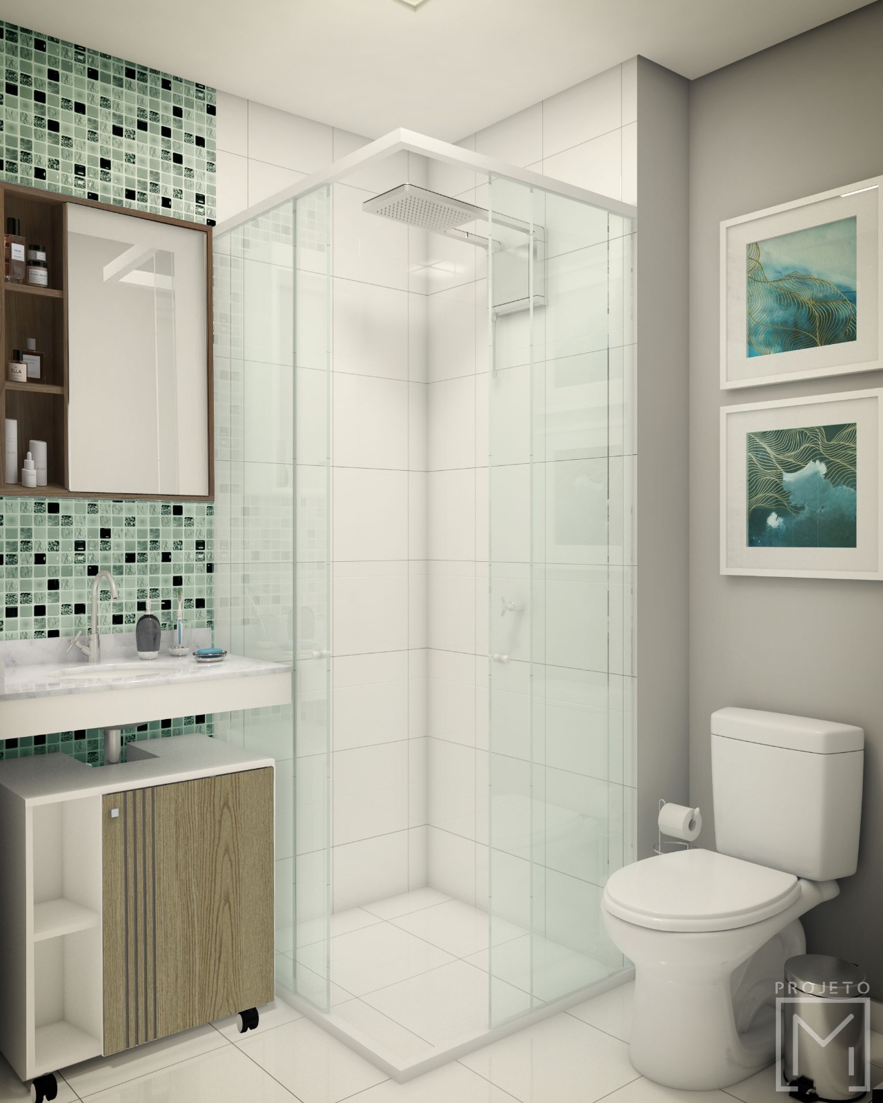 Com o mesmo layout, acrescentamos pastilhas adesivadas e quadros decorativos nas paredes.