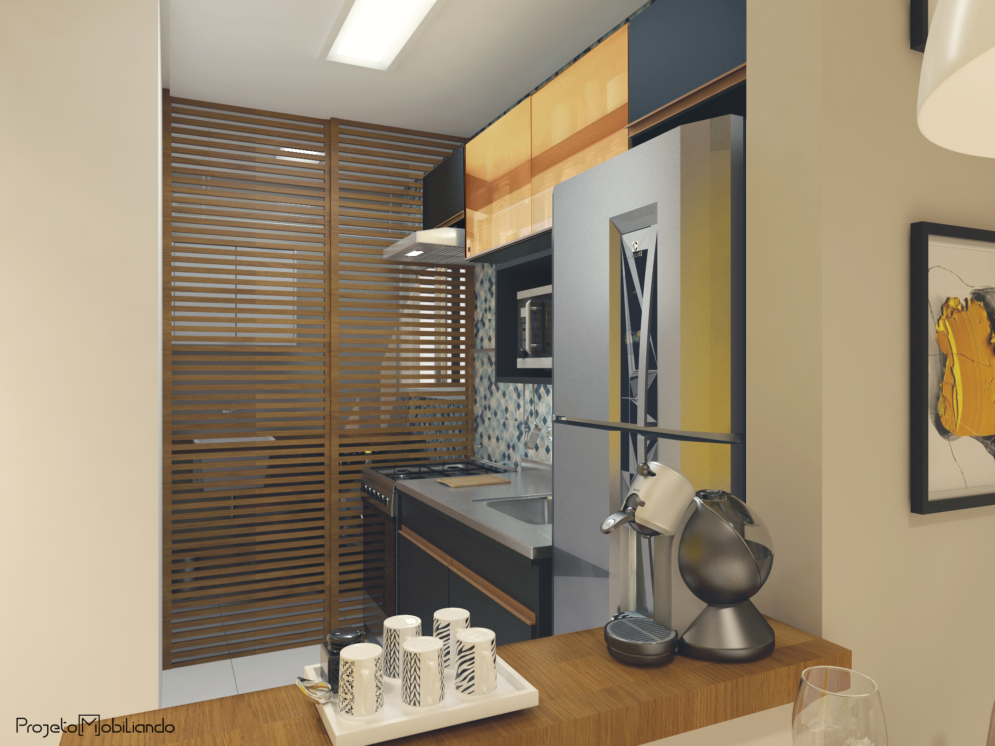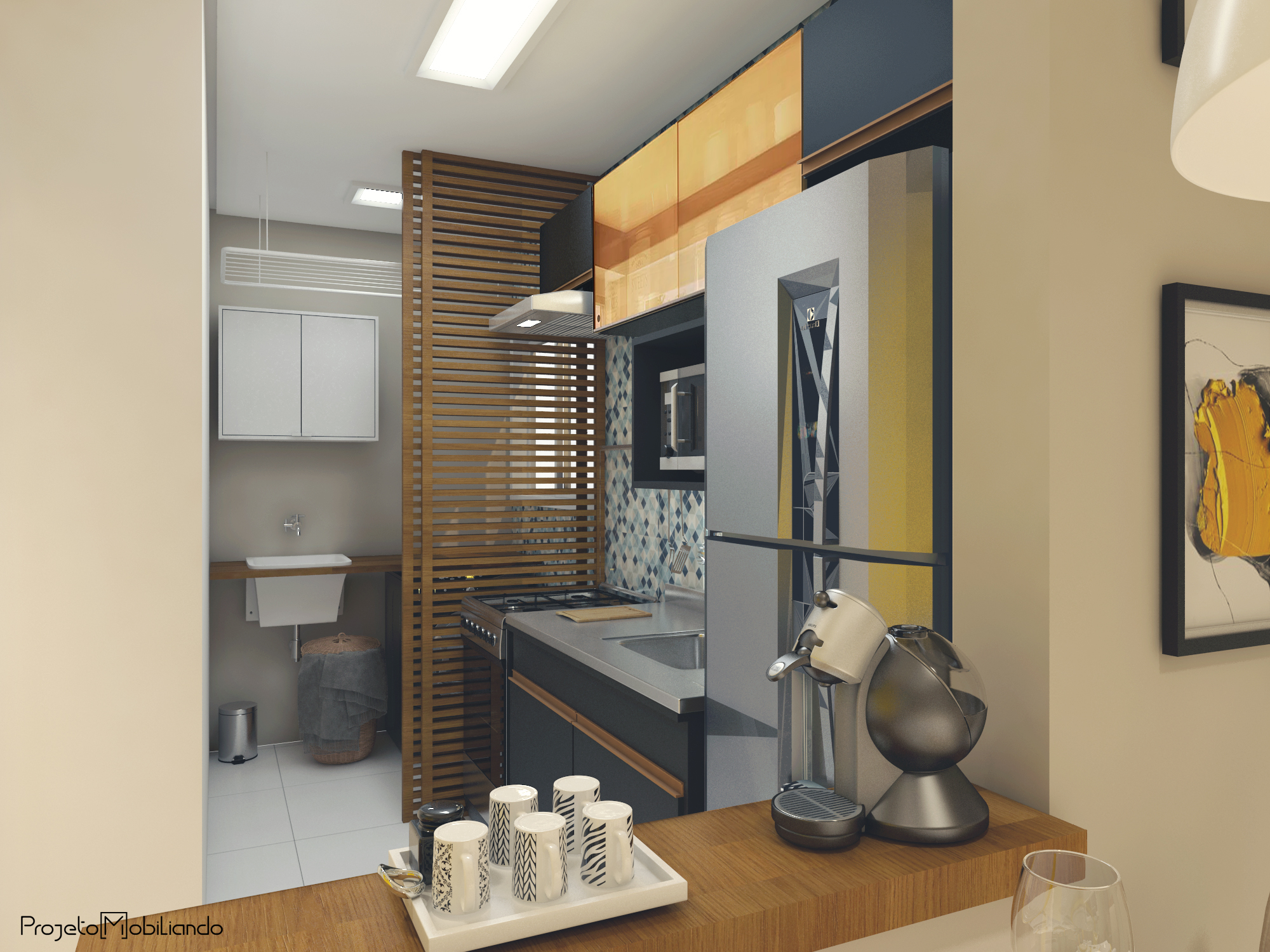 Use um layout linear com móveis modulados e armários aéreos. Assim, você libera a circulação, ganha espaço de armazenamento e mantém a cozinha funcional, mesmo em áreas de menos de 6 m².