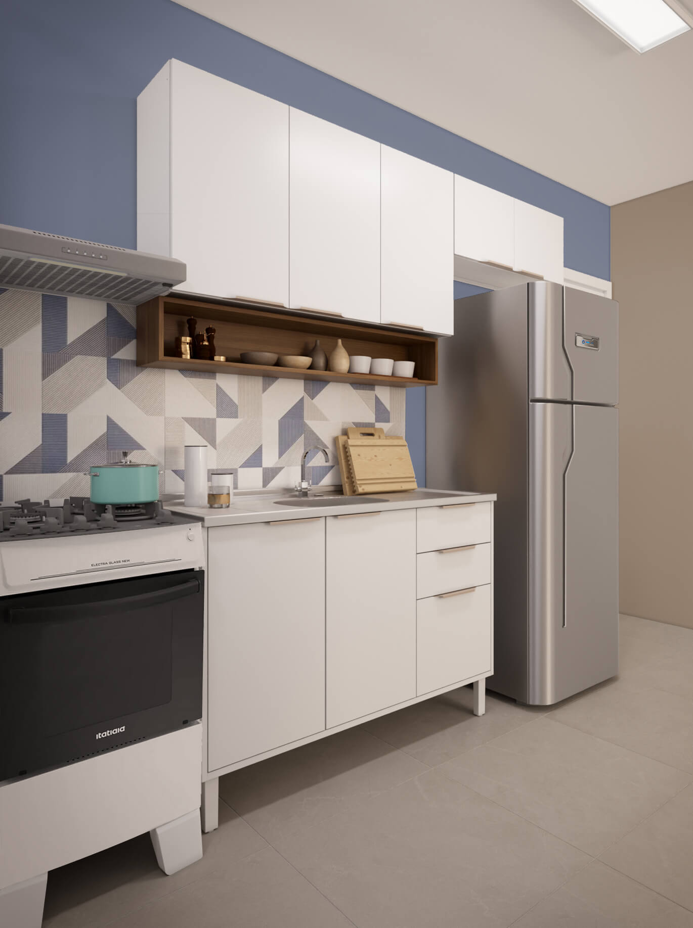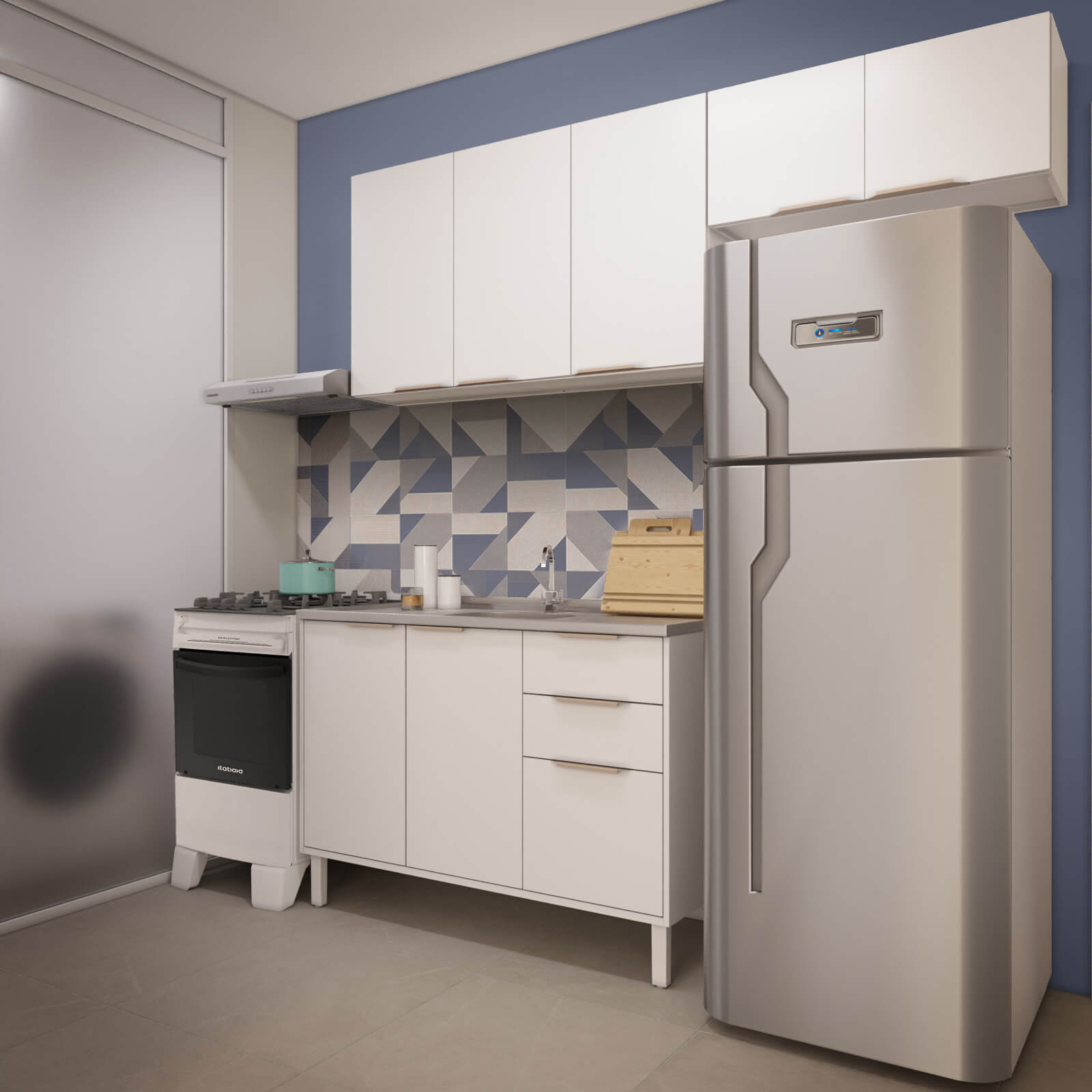 Dica prática: antes de comprar, meça o espaço entre pia, fogão e geladeira. Em cozinhas lineares como esta, o equilíbrio das larguras é o segredo.