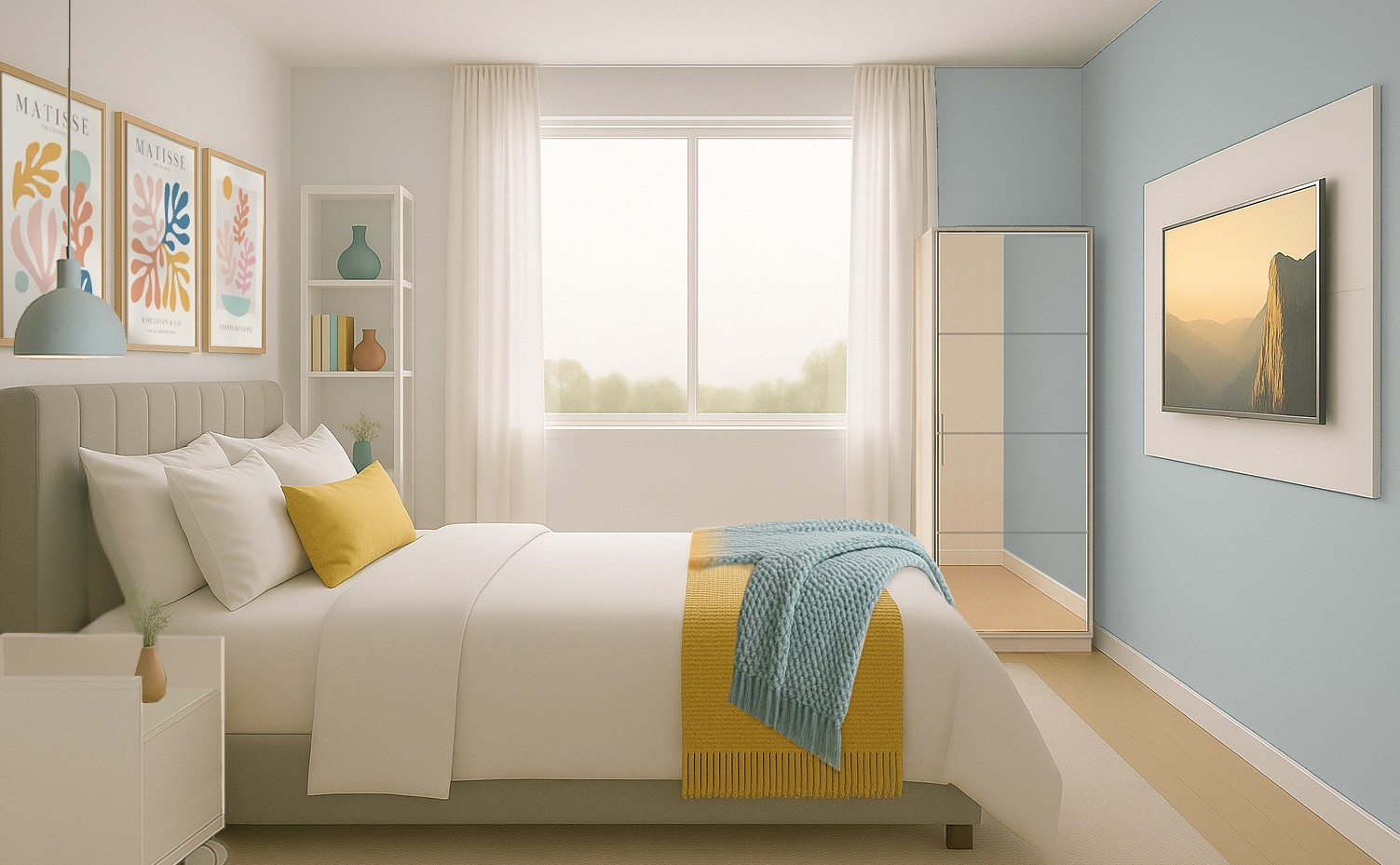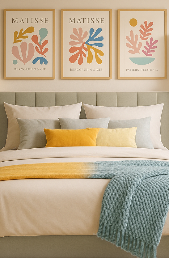 🟦 Parede azul suave e quadros inspirados em Matisse: criam uma composição artística leve, colorida e cheia de personalidade — sem pesar no ambiente.
