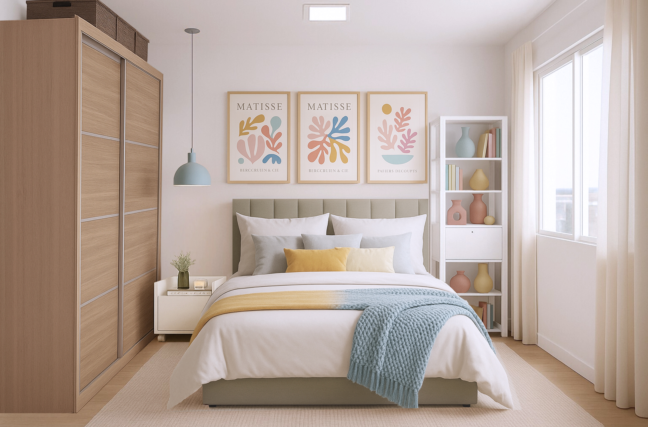 O Quarto Matisse é ideal para casais que moram em apartamentos pequenos e querem um ambiente bonito, funcional e fácil de montar. Com móveis acessíveis que cabem no orçamento e na planta, não precisa de obra nem complicação — é decoração real, pra quem quer fazer mais com menos.
