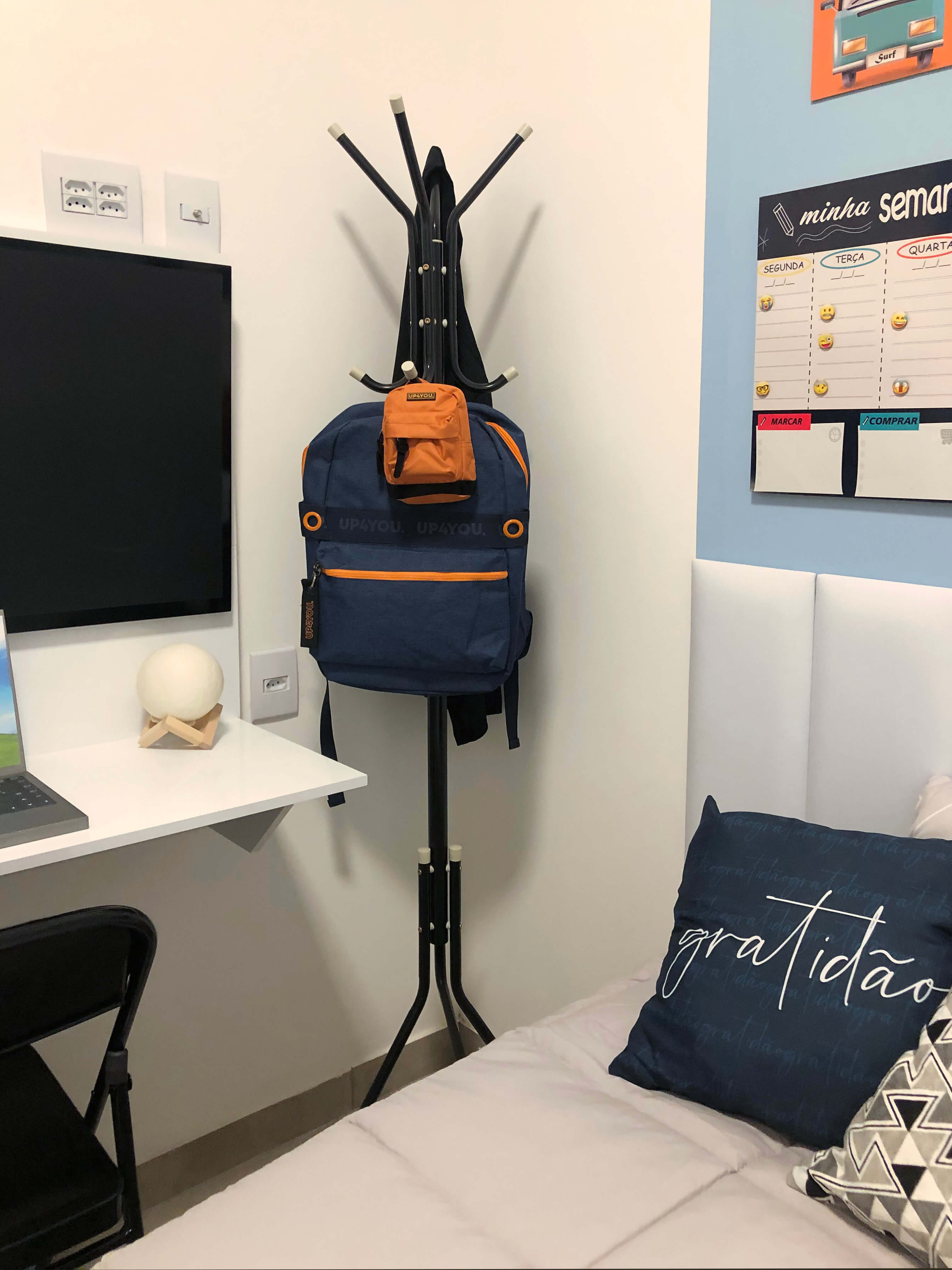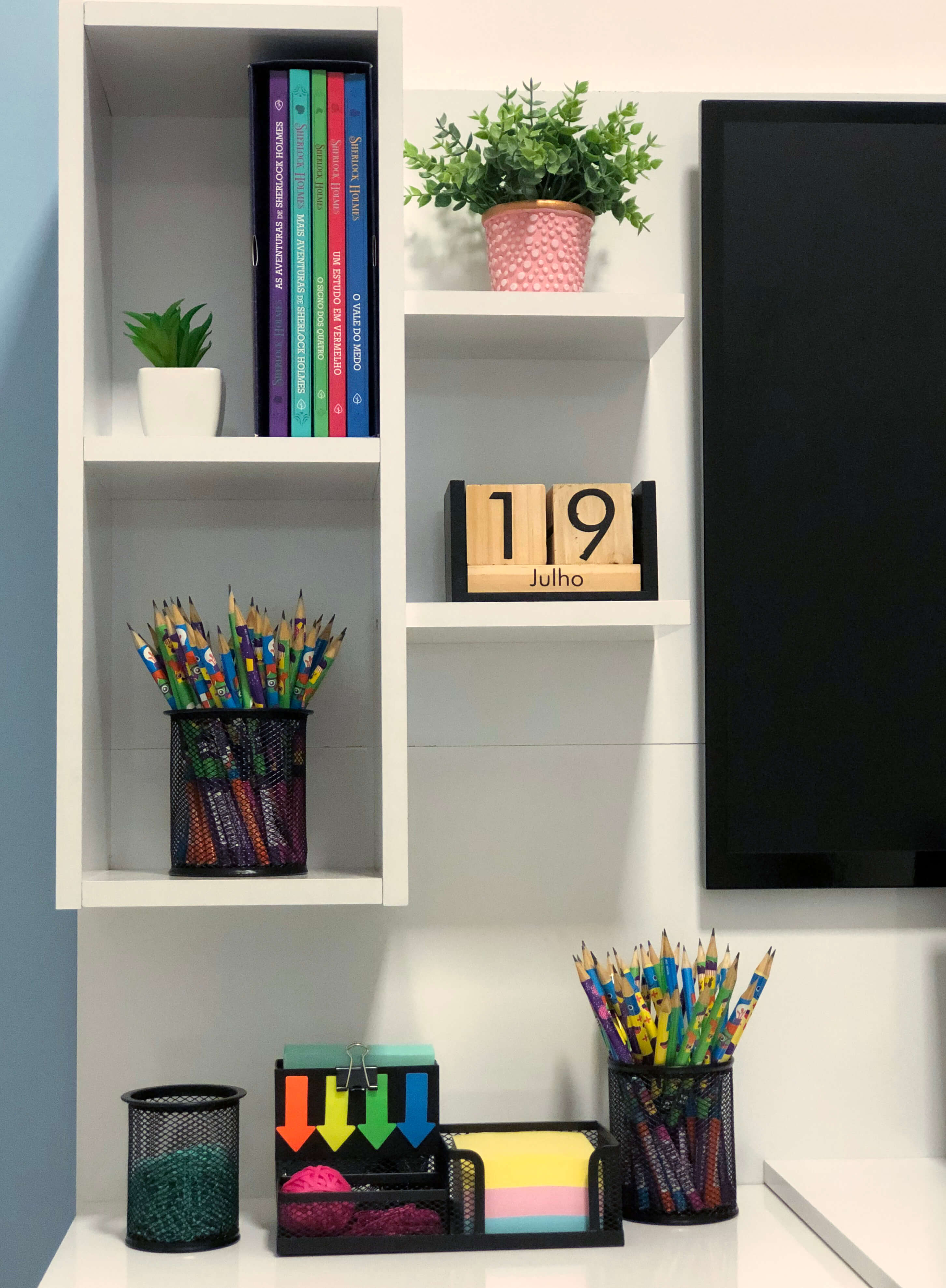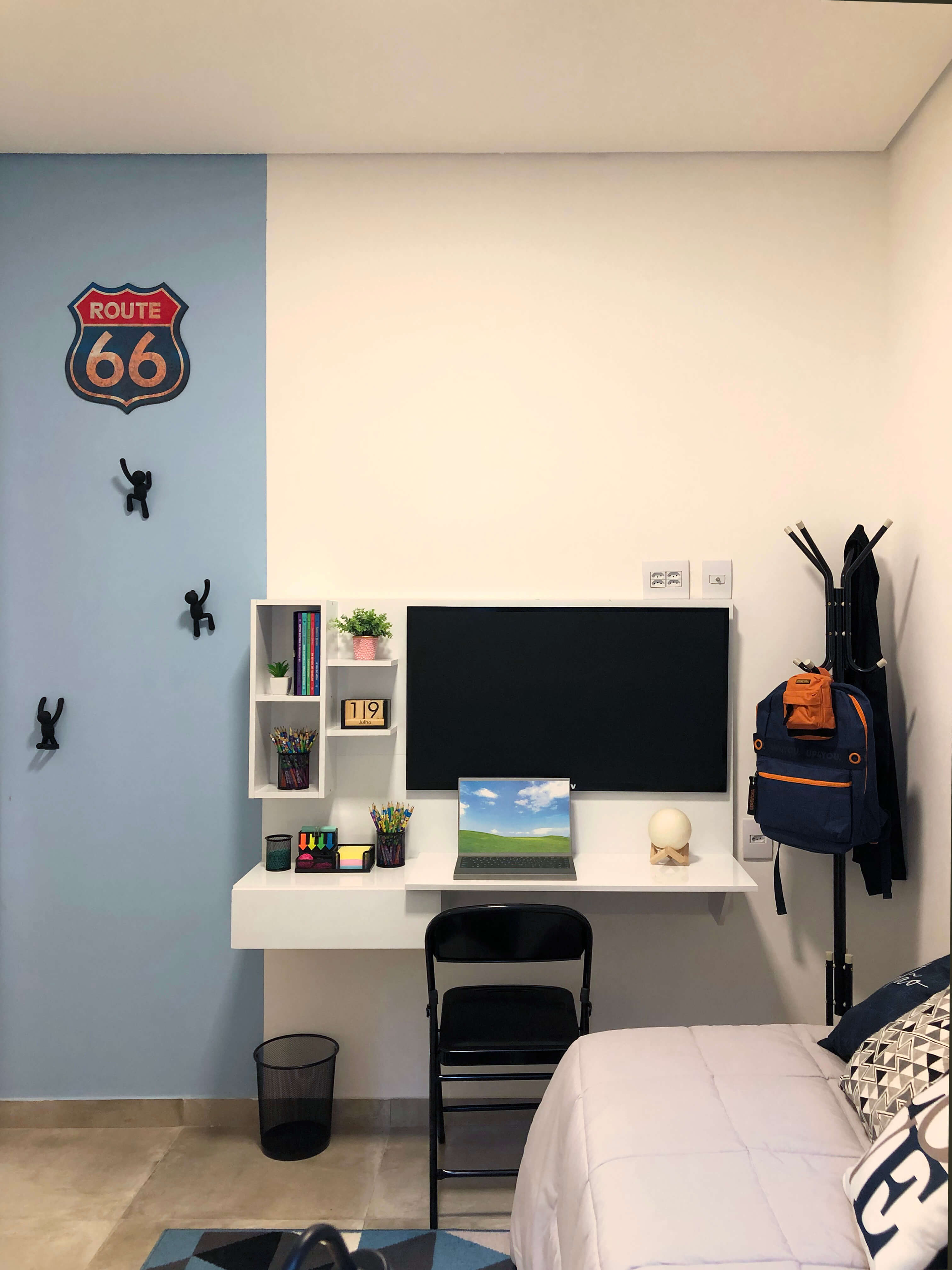 Os nichos e prateleiras ajudam na organização de livros e materiais escolares, enquanto o painel preto fosco funciona como um quadro para anotações e ideias do dia a dia.
