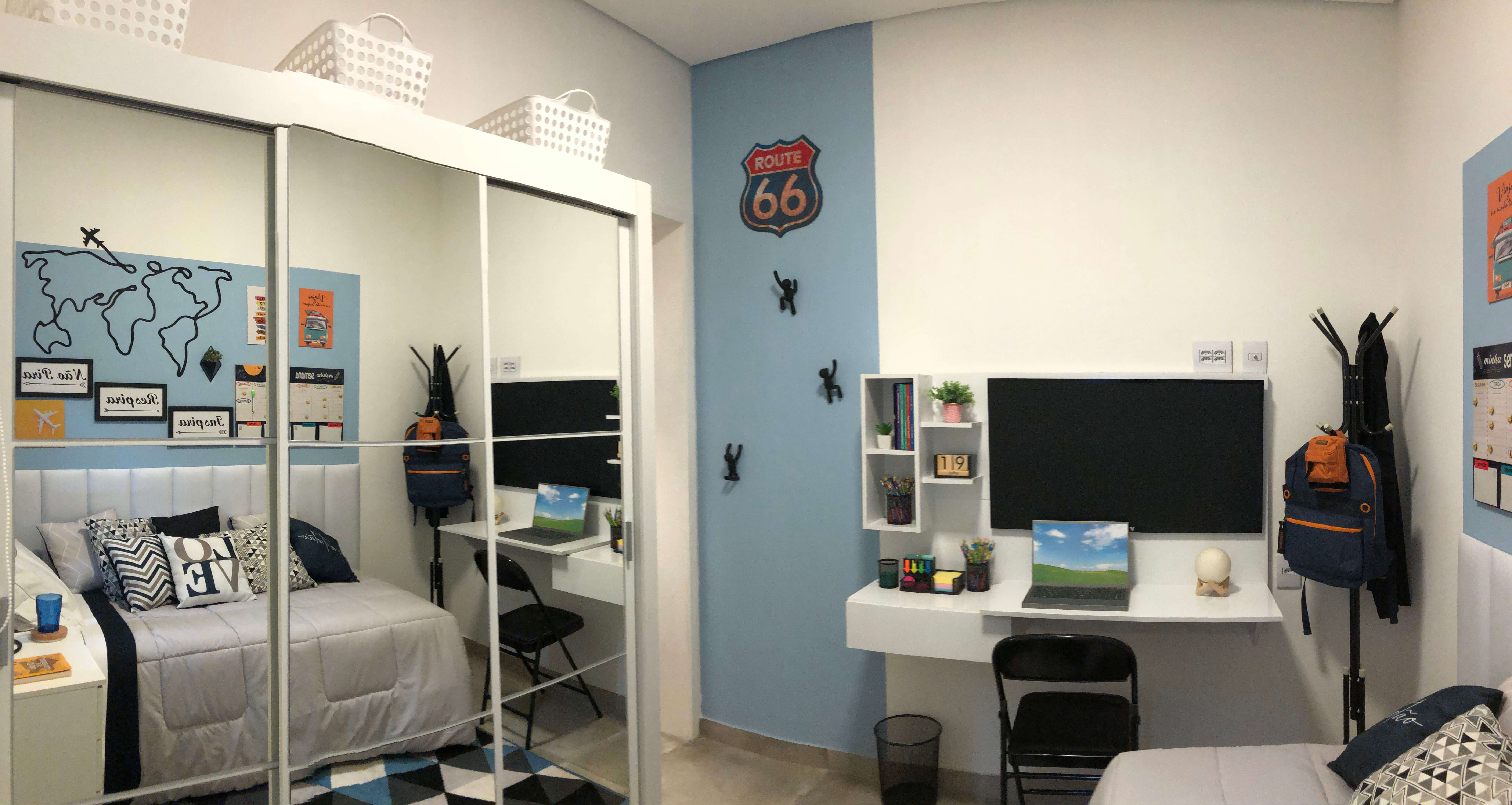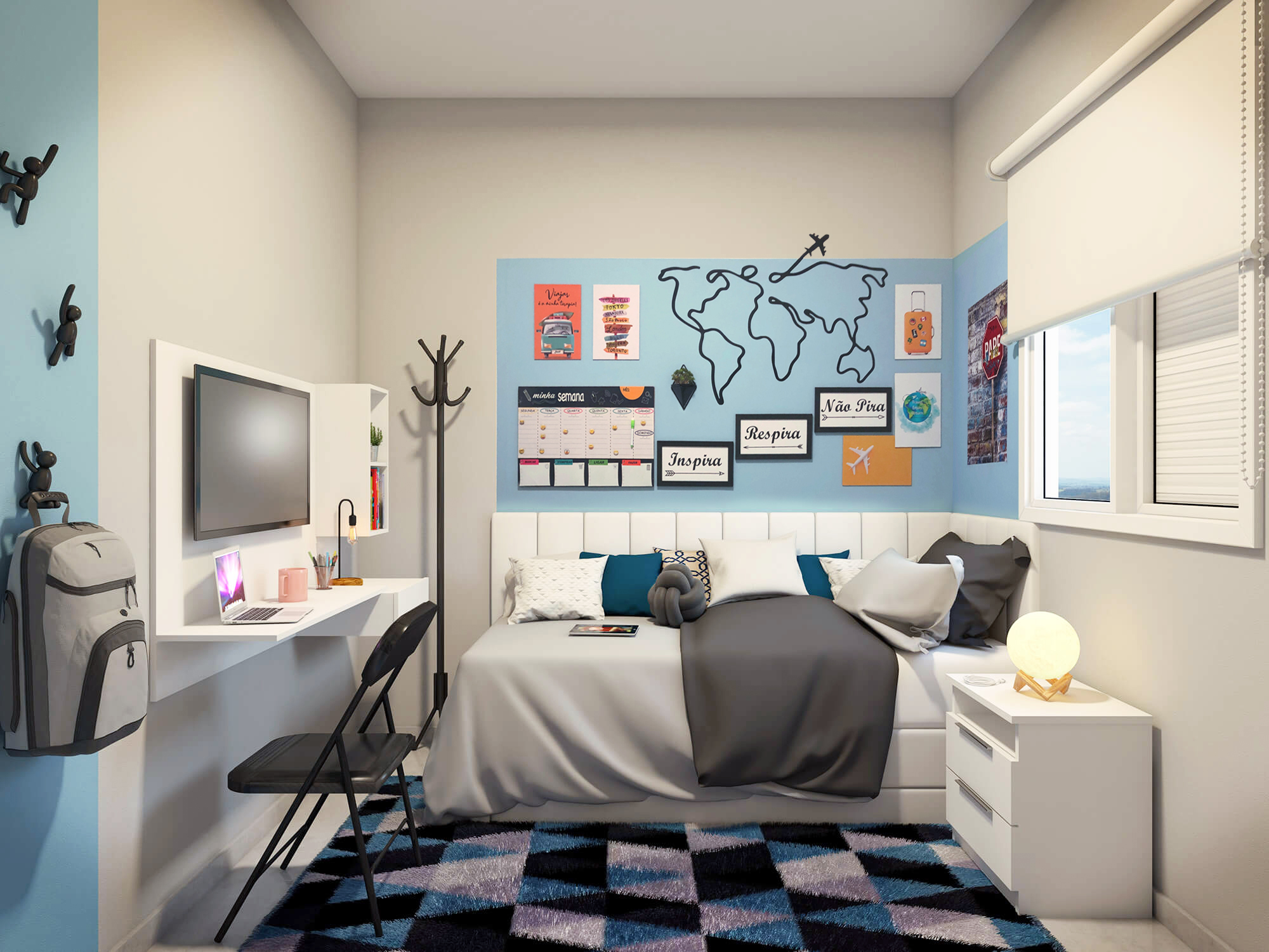 Com apenas 2,67 × 2,61 m, o desafio foi criar um espaço funcional e cheio de personalidade para um jovem que precisa estudar, descansar e ainda ter seu cantinho com identidade.