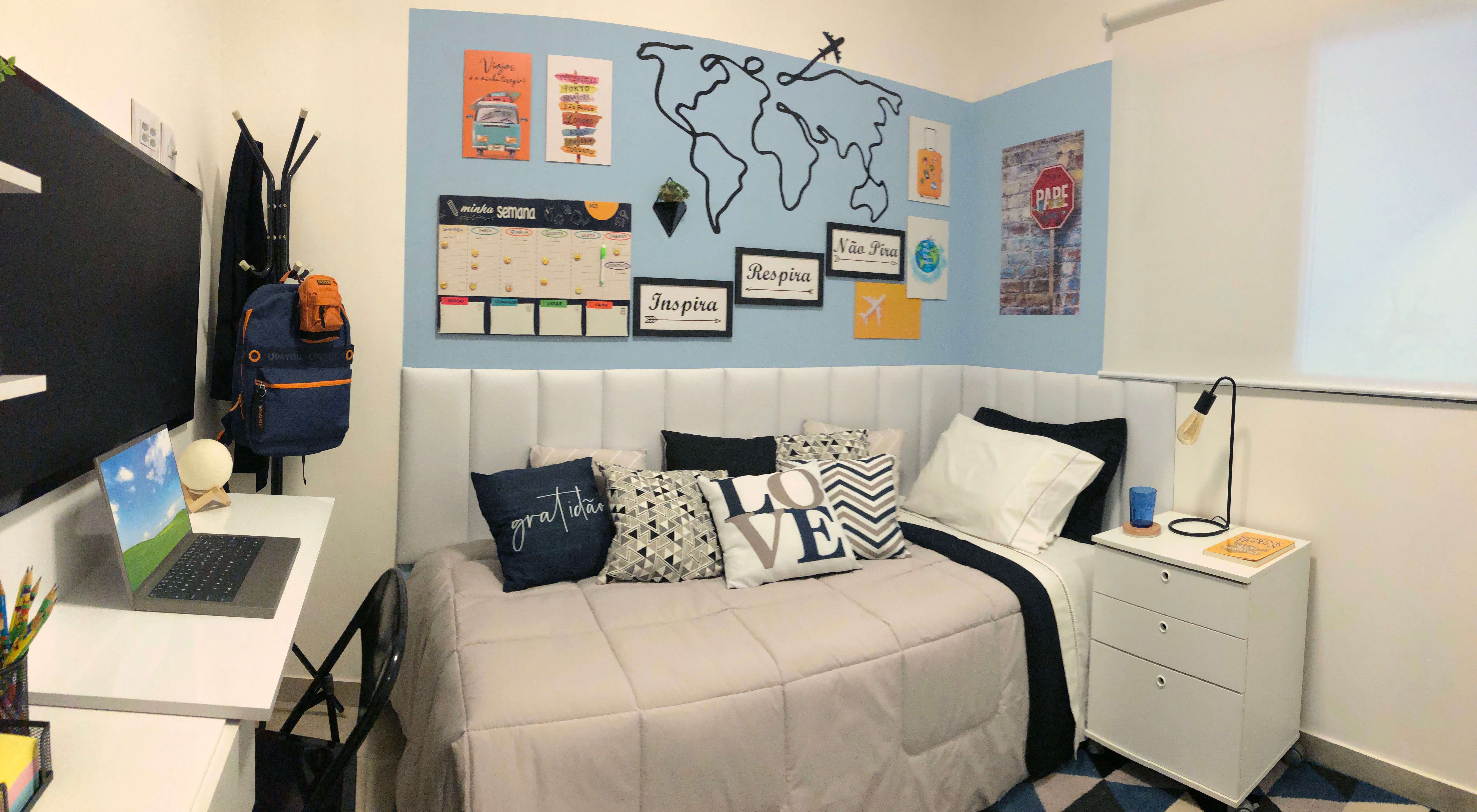 A parede azul divide o ambiente de forma equilibrada e serve de fundo para o painel criativo de quadros e mapas, que traz leveza e um toque de sonho, perfeito para adolescentes ou jovens adultos.