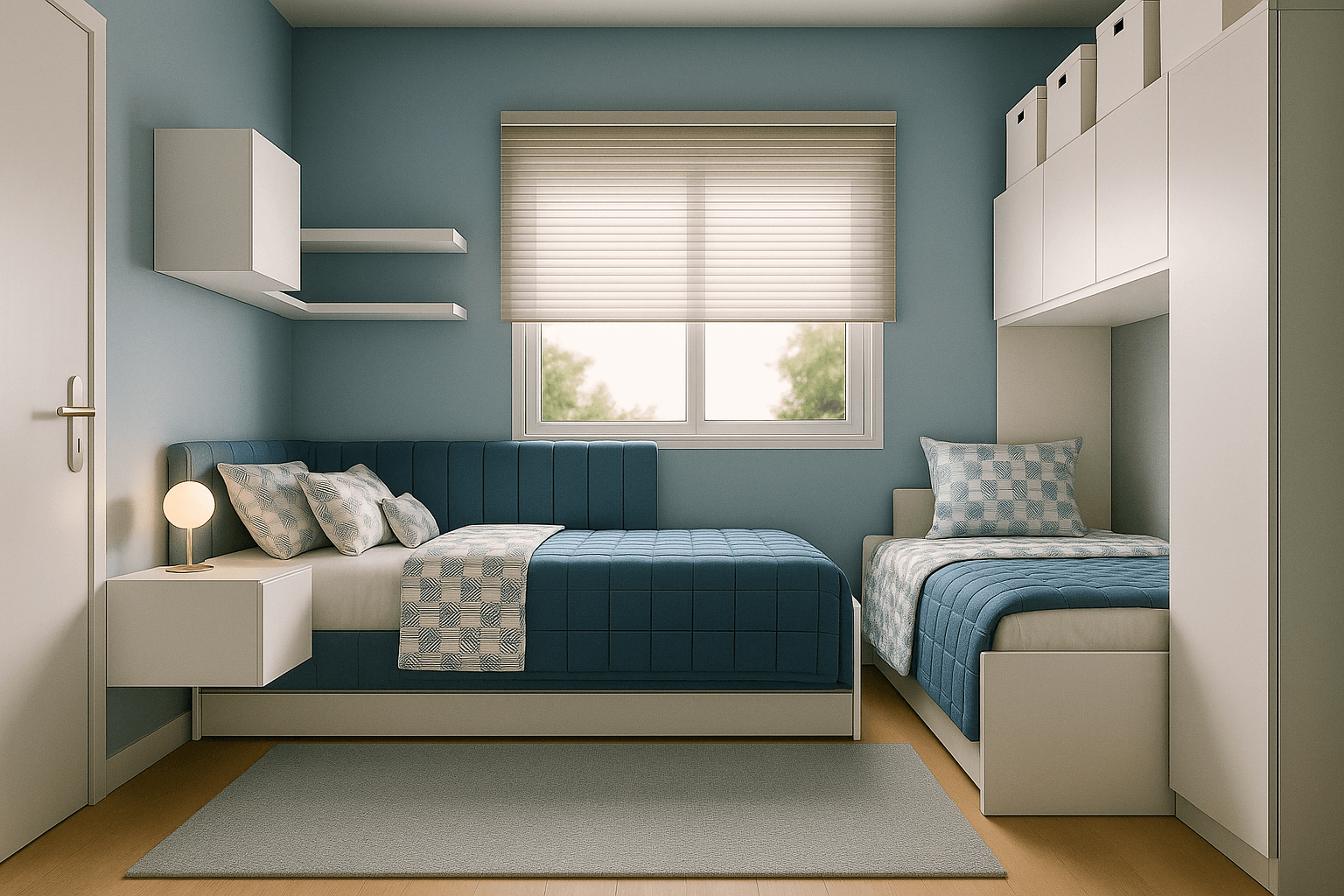Neste projeto, criamos um quarto infantil compartilhado para duas crianças em um apartamento popular tipo Minha Casa Minha Vida (MCMV).